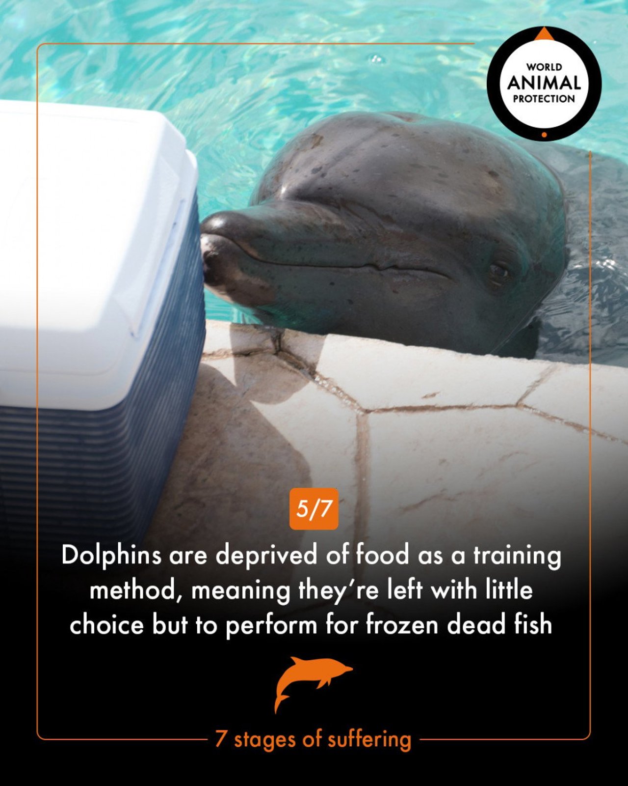 Dolphins are deprived of food as a training method, meaning they’re left with little choice but to perform for frozen dead fish.