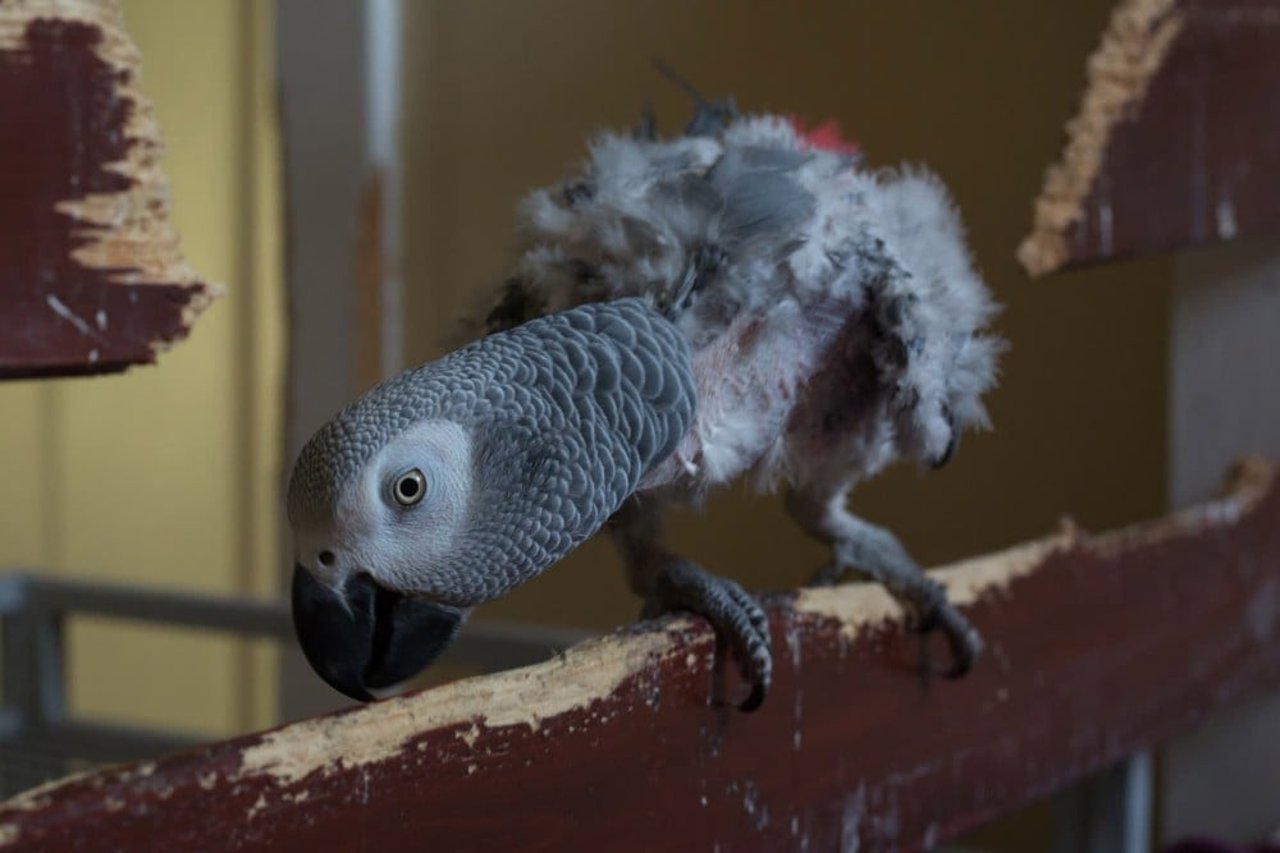 An African grey parrot in captivity. He has plucked out his feathers due to stress